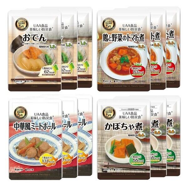 ●内容量:180g(おでん)・90g(かぼちゃ煮)・130g(鶏肉と野菜のトマト煮)・120g(中華風ミートボール)×各3袋